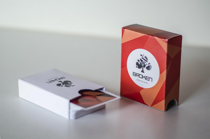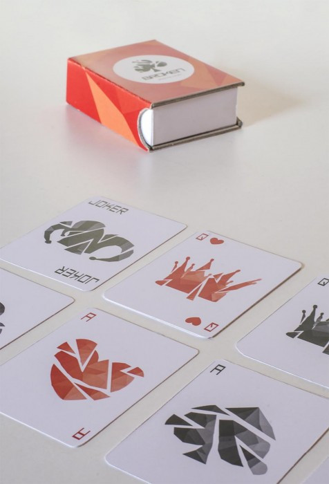 The classic playing cards have been given a makeover. The recognizable icons have been broken and rearranged into delicate and modern forms. The geometric 'glass cracks' are repeated in the entire design resting on a clinical white background. The use of color and packaging is inspired by the simplicity of antique playing card decks.
