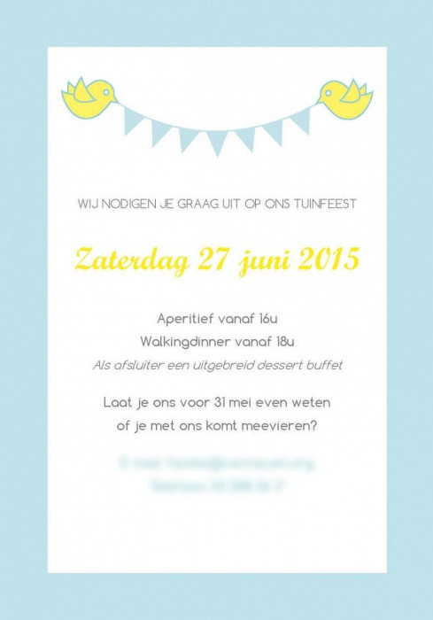 Invitation for a private garden party in the summer of 2015. The card is printed on 300 g/m2 coated paper and with the dimentions 200 x 138 mm it fits comfortably into an A5 envelope.