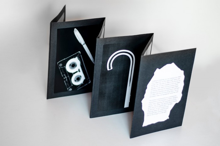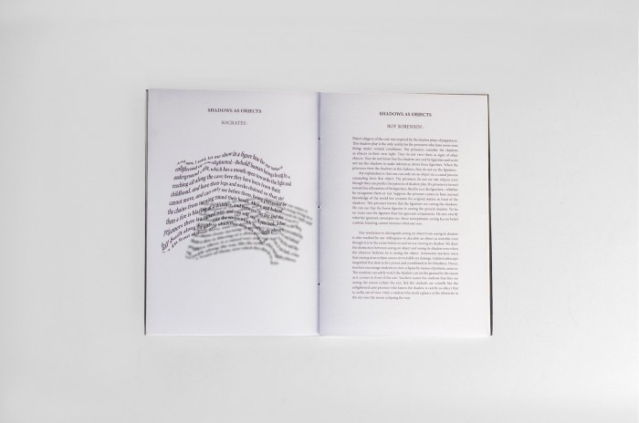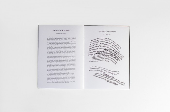 The structure of the finished booklet is inspired by the ‘Socratic debate’ which is a form of dialectical method. It is a sort of dialogue based on asking and answering questions to stimulate critical thinking and to draw out ideas and underlying presumptions. The pages of the booklet depict an imaginary dialog between Socrates and Roy Sorensen as they discuss the perception of shadows but leave the reader to form his own conclusions.